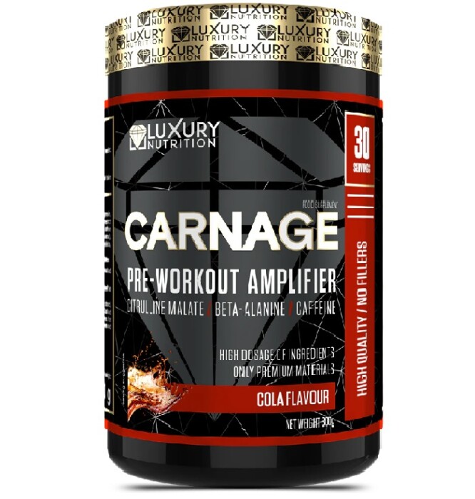 – يحتوي Carnage على كمية كافية من بيتا ألانين الذي يساعد في تحمل العضلات أثناء التمرينات عالية الكثافة .